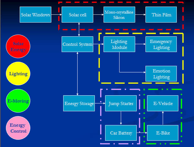 公司主要創新產品可分四大類:照明電源、汽車電池、太陽能建築系統、電池管理系統等,在能源控制系統上獲得不少國內外新型與發明專利。